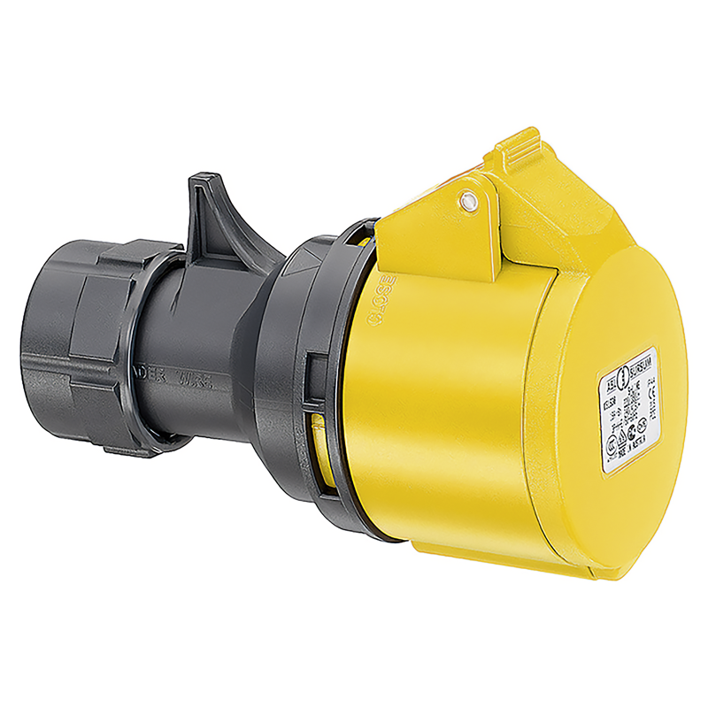 CEE Kupplung 16/3 IP44 110V 4h gelb, Klappdeckel mit Daumengriff, turn2fix
