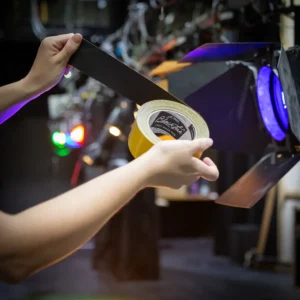BlackTak™ Lichtmaskierungsfolie – Selbstklebende, hitzebeständige Folie (bis zu 180 °C) zur Kontrolle von Lichtstreuung. Matt schwarze, nicht-reflektierende Oberfläche, flexibel und leicht von Hand reißbar. Perfekt für TV-, Film- und Theaterproduktionen.