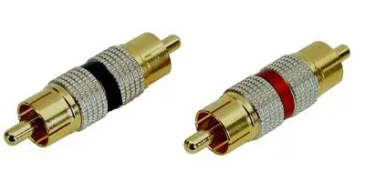 Cinch (RCA) Adapter male auf male mit vergoldeten Kontakten. Die Adapter sind mit je einem roten und einem schwarzen Ring markiert. Sie werden paarweise abgegeben.