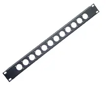 Schwarzes 19» Anschlussfeld aus Stahl mit U-Kanten und 1 HE, mit 12x Ausschnitten für XLR-Steckverbinder der D-Serie.