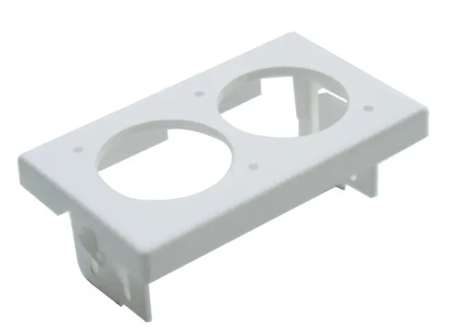 Weisse, unbestückte FLF-Montageplatte mit zwei D-Serie-Ausschnitten, mit Kunststoffklammern inkl. Montageschrauben. Geeignet für die meisten Neutrik D-Serie Einbausteckverbinder. Von den RJ45-Versionen passen nur Cat.6A-Serie (A tiefgestellt) NE8FDX*.