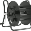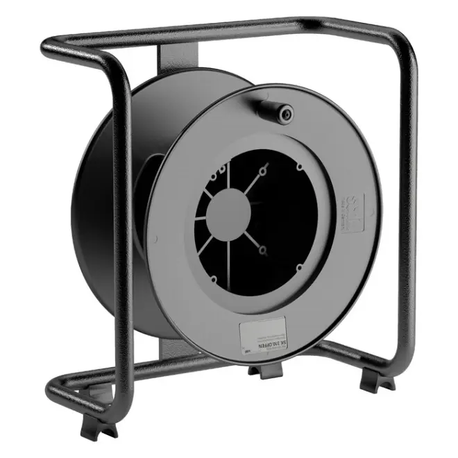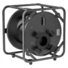 Schwarze, offene Kabeltrommel aus Kunststoff mit einem Kerndurchmesser von 170 mm. Tragbare und stapelbare Spezialversion für die professionelle Veranstaltungstechnik. Das Leergewicht beträgt 4,4 kg.