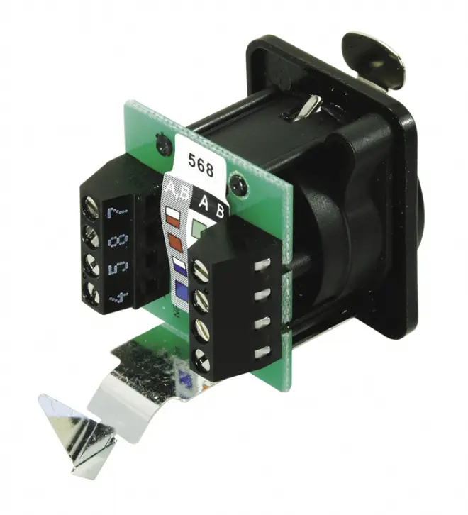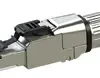 RJ45-Einbaubuchse mit schwarzverchromtem D-Serie-Gehäuse, vertikaler Leiterplattenmontage und mit nummerierten Schraubklemmen für Kabelquerschnitte bis 1,5 mm². Max. Frontplattenstärke: 4 mm, inkl. 2 Befestigungsschrauben.