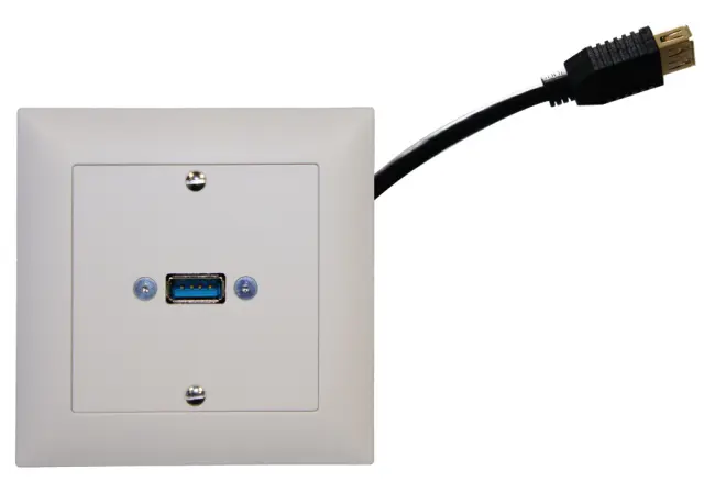 Weisses Unterputz-Montageset EDIZIOdue, bestückt mit einer USB-Kabelpeitsche female/female von ca. 15 cm Länge und einem Abdeckrahmen aus Kunststoff. Die Kabelpeitsche ist geschraubt.