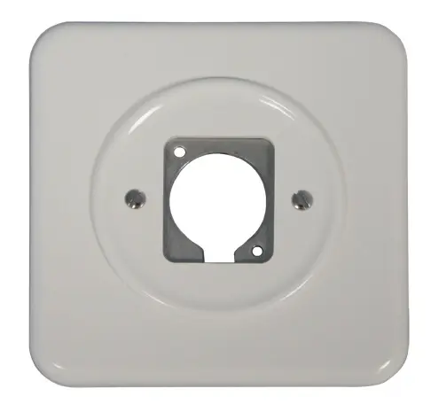 Weisses Unterputz-Montageset STANDARDdue aus hochwertigem Duroplast-Material, mit einem D-Serie-Ausschnitt und einem runden Abdeckrahmen von 58 mm Durchmesser. Der innere Montagerahmen ist aus Metall.