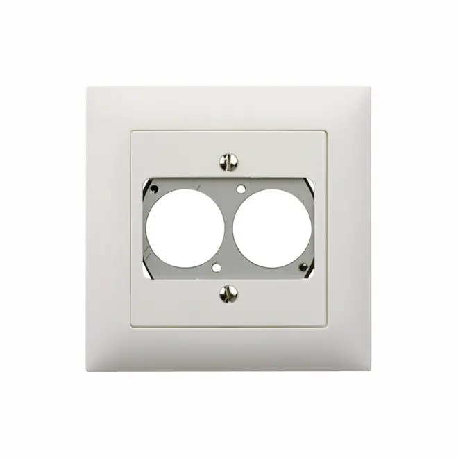 Unterputz-Montageset EDIZIOdue mit Ausschnitt für 2x Chassissteckverbinder der D-Serie (XLR, BNC, EtherCon, Cinch, Jack, Speakon, etc.), Befestigungsplatte mit M3-Gewinde, isoliert gegenüber der Grundplatte, Abdeckrahmen aus Kunststoff weiss, grau oder schwarz, Abmessungen 88×88 mm.