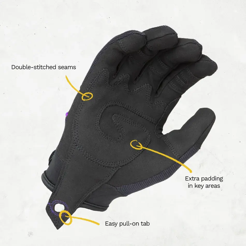 - Verstärkungen an stark beanspruchten Stellen: Handfläche & Fingerspitzen widerstehen Abrieb und Belastung.