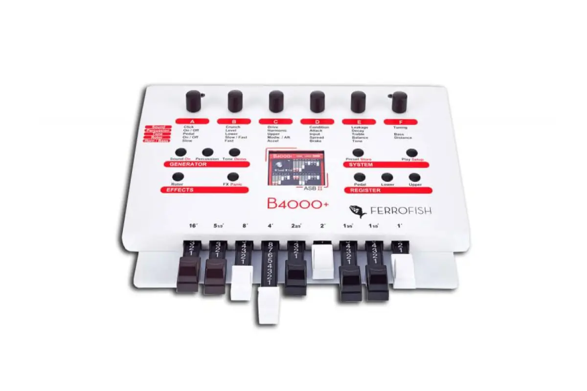 Organ Soundmodul incl. Drawbars. Die B4000+ ist die einmalige Kombination aus fantastisch authentischem Orgelsound verpackt im hochwertigen modernen Design. Echte Endlosregler Potentiometer und TFT Display machen die Bedienung zum Vergnügen. Höchste Detailtreue der Sounderzeugung wird dich überzeugen. Dank des Sharc DSP’s von Analog Devices und einem Cortex 3 ARM Prozessor gibt es Rechenleistung satt für deine Ohren. Drei Manuale mit jeweils voller Polyphonie, Percussion mit Einstellmöglichkeit der Harmonischen, Attack und Decay, Tonewheel Emulation mit einstellbaren Alterungsparametern, Emulation des Keyclicks und der Tastenkontakt Verzögerung, Realistischer Sound durch physical circuit modelling, Rotary Speaker Emulation, Tube Amp Emulation mit Distortion, Effekte: Chorus/Vibrato, Hall, Kompressor, externes Audiosignal kann durch die Effekte geleitet werden, globales Tuning, Hüllkurve mit Attack und Decay für jedes Manual einstellbar, MIDI Keysplit und Velocity, Neun Zugriegel, Sechs hochauflösende Encoder, TFT Color-Display, ARM Cortex M3 und Sharc DSP Prozessoren, USB Schnittstelle mit MIDI over USB, Zwei MIDI Eingänge, galvanisch getrennt, Stereo Analog- sowie Kopfhörerausgang, Stereo Analog Eingang, Anschluß für Lautstärkepedal, Anschluß für Rotor oder Sustain Schalter.