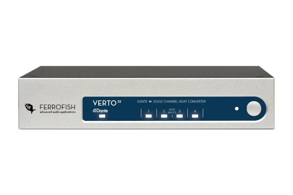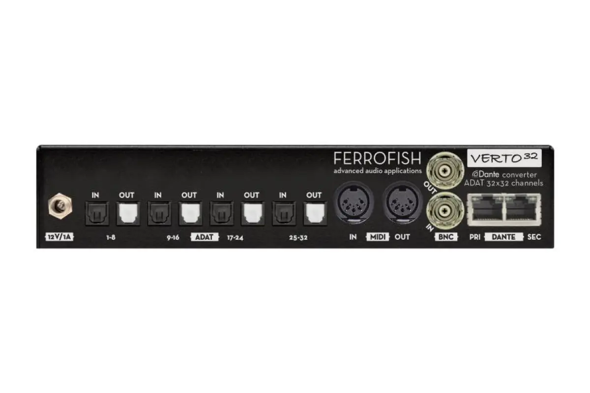 32-Kanal ADAT Dante Konverter. Mit der Verto 32 ist es nun möglich, bis zu 32 x 32 Kanäle über ADAT I/O´s auf einfachste Weise in ein Dante Netzwerk zu integrieren. Egal, welches ADAT Gerät – die Verto 32 stellt alle 32 x 32 Kanäle sofort „plug and play“ im Dante Netzwerk zur Verfügung. Das ultra kompakte Gerät bietet insgesamt acht optische ADAT TOSLINK Buchsen: Vier zum Übertragen von ADAT zu Dante, sowie weitere vier Buchsen für die andere Richtung. Auf der Dante Seite befinden sich zwei RJ45 Buchsen, vorbereitet für redundanten Betrieb. Die Verto 32 unterstützt bis zu 96kHz Samplerate, MIDI Buchsen zum Firmware Update sowie BNC Wordclock Buchsen für eine externe Synchronisation.