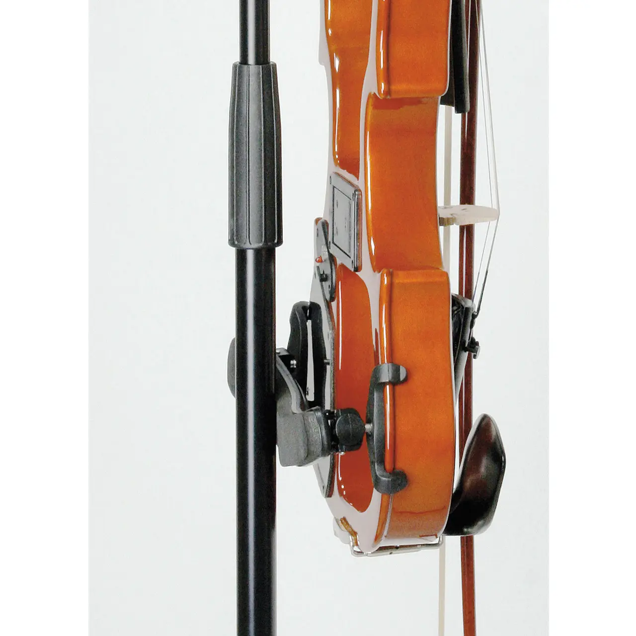 Egal ob Konzertsaal, Musikschule oder für zu Hause: mit dem neuen König & Meyer Violinenhalter für Stative haben Sie Ihr Instrument immer griffbereit. Mittels Klemmelement mit oberflächenschonender Gummieinlage kann der Halter an alle zylindrischen Rohre bis zu einem Durchmesser von 30 mm montiert werden. Die Violine wird am gewölbten Ende des Wirbelkastens aufgenommen, dadurch wird das unbeabsichtigte Verstellen der Wirbel verhindert. Durch die tiefe Form des Halters ist ein Herausdrehen oder Fallen des Instrumentes praktisch ausgeschlossen. Der integrierte Bogenhalter komplettiert den perfekten Einsatz der flexiblen Halterung. Der strapazierfähige Flocküberzug und der zusätzliche Klettbandschutz schonen die Violine vor dem Verkratzen und vor dem Anschlagen am Rohr. Geeignet für Violine und Viola.Produktdaten: