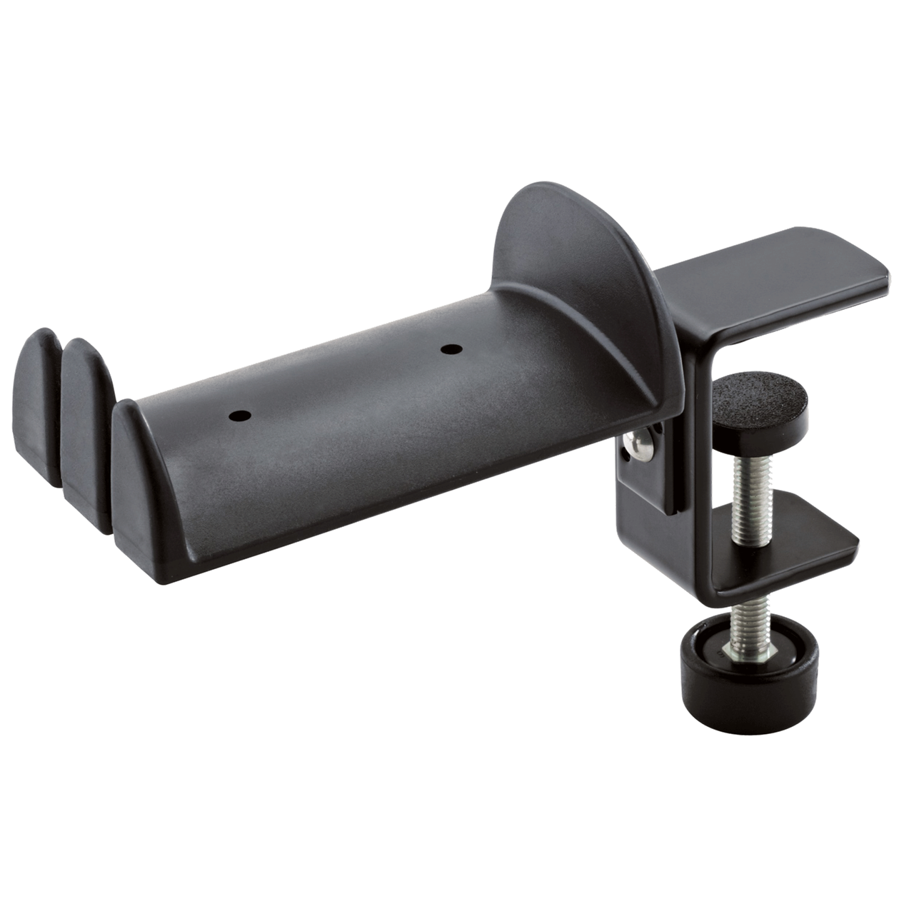 Schonende und stabile Ablage mit weicher gummierter Auflage für die Aufnahme von 2 Standard Kopfhörern. Zusätzlich können an der geschlitzten Stirnseite 2 In-Ear-Kopfhörer bequem eingehängt werden. Der Klemmbereich erstreckt sich von 0 bis 45 mm und ermöglicht so eine sichere Befestigung an unterschiedlichen Tischplatten, Regalfächern etc.
