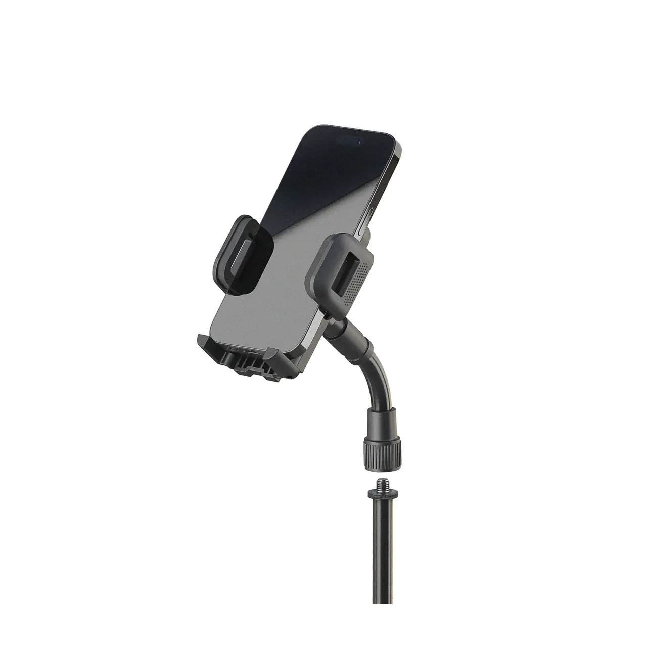 Mit diesem universellen Halter ist Ihr Smartphone immer in Reichweite. Der Halter ist geeignet für alle flachen Geräte mit einer Breite von 45 bis 90 mm. Die Bedienung ist einfach und schnell. Smartphone einlegen – Klemmbacken zusammen drücken – fertig. Auf Knopfdruck wird das Gerät wieder freigegeben. Die Klemmbacken mit integrierter Gummiauflage garantieren einen sicheren Halt. Die beweglichen Auflagen können, wenn nötig auch komplett eingeklappt werden. Dank des Kugelgelenks kann der Halter nach oben und unten geneigt und um 360° gedreht werden. Durch den flexiblen Haltearm mit dem 3/8“ Mikrofongewindeanschluss ist der Smartphone-Halter vielseitig einsetzbar.