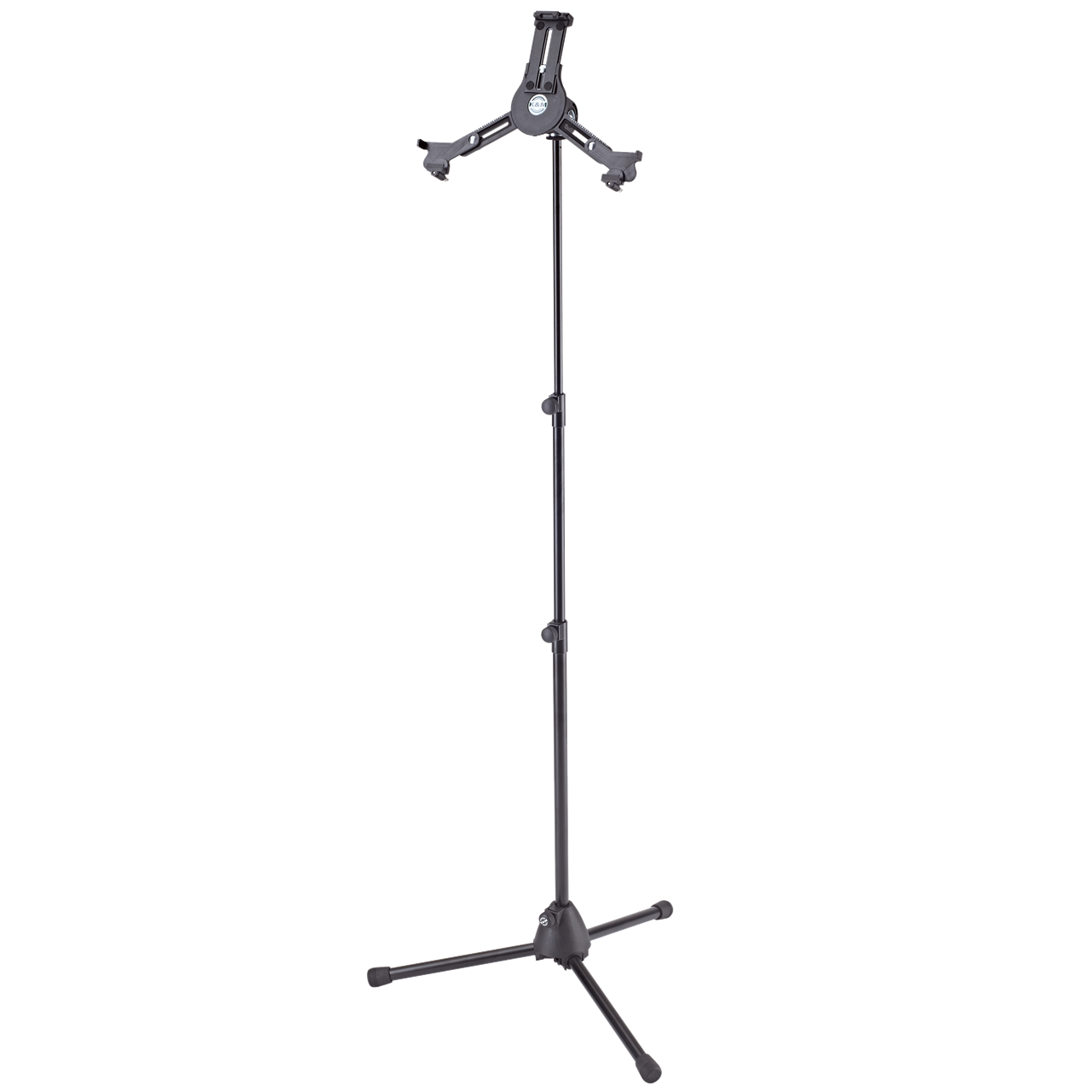 K&M 19793 Tablet-PC-Stativ Universal komplettDie Kombination aus Stativ und Universal Tablet Halter unterstützt Sie auf der Bühne genauso wie zu Hause oder im Studio. Die individuell einstellbaren Haltearme ermöglichen den Einsatz von Tablets mit einer Höhe von 222 bis 334 mm und einer Breite von 128 bis 232 mm (wie z. B. iPad, iPad Air, iPad Pro 12,9″ & 9,7″,Amazon Fire HDX 8.9, Samsung Galaxy Tab ab 9.7, Google Nexus 9, Asus Transformer oder Microsoft Surface sowie Surface Pro). Die Tiefe des Tablets kann dabei zwischen 6 und 11 mm variieren. Beim erstmaligen Einstellen werden die drei Haltearme mittels Klemmschrauben auf die Größe und Tiefe des Tablets eingestellt. Für die weitere Nutzung wird das Tablet dann ganz einfach und schnell über einen Schnappverschluss eingesetzt und auch wieder entnommen. Eine handliche Flügelmutter ermöglicht die stufenlose Einstellung der Neigung, so dass jeder Anwender seine individuelle Position leicht finden kann. Das Tablet kann zwischen Hoch- und Querformat kurzerhand gedreht werden, wobei ein selbstständiges Drehen verhindert wird. Das leichte und 2-fach ausziehbare Stativ lässt sich stufenlos auf eine Höhe zwischen 70 und 155 cm einstellen. Ein kleines kompaktes Packmaß sorgt für einen angenehmen Transport.