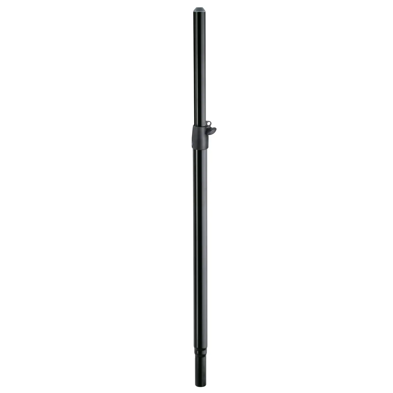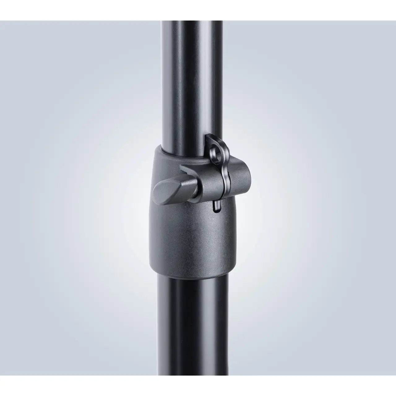 Stahlrohrkombination für die Verwendung in Subwoofern mit Flanschbuchse. Die Höhe wird mit einem Sicherungshaken fixiert und per Klemmschraube geräuscharm und spielfrei gesichert. Das schlanke Design der Spannschelle ermöglicht einen platzsparenden Transport und sorgt für ein dezentes Erscheinungsbild. Die nutzbare Höhe liegt zwischen 955 und 1.480 mm und wird in 3 Stufen zu 175 mm erreicht. Eine praktische Aufsteckhilfe erleichtert zudem die Boxenmontage.