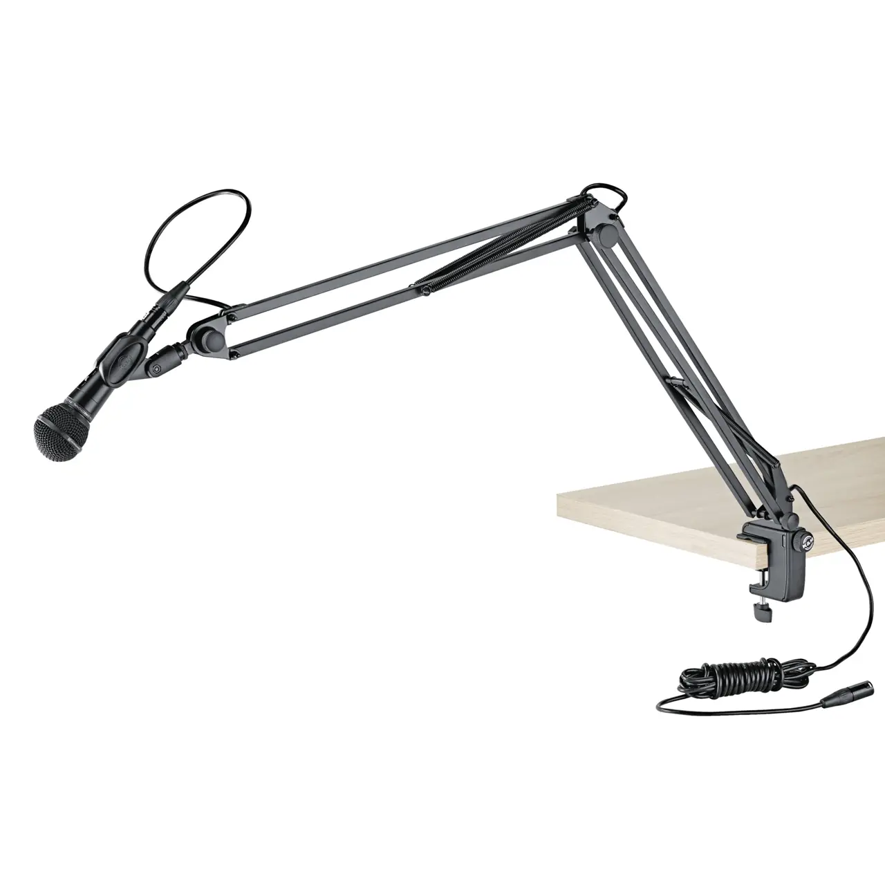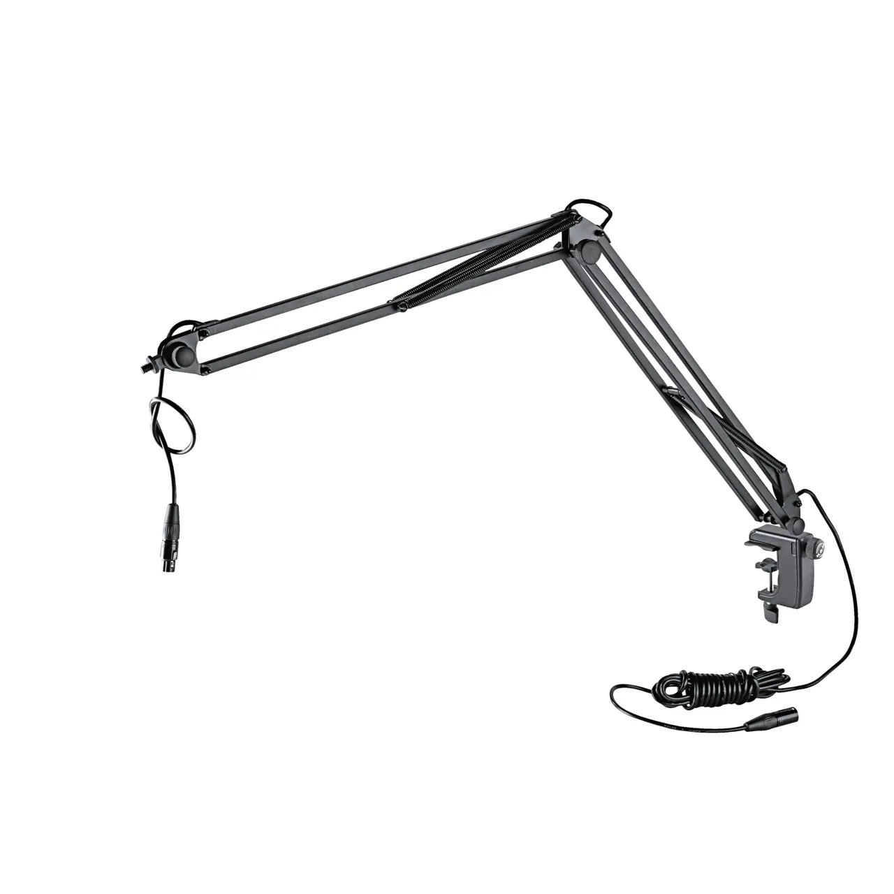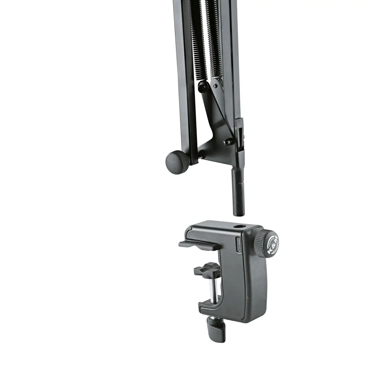 K&M 23850 MikrofonarmDer beliebte und leichtgängige Tisch-Mikrofonarm mit 3/8″ bzw. 5/8″ Gewindeanschluss für Tonstudios und Multimedia-Arbeitsplätze jetzt mit neuer innovativer Tischklammer. Mikrofone mit einem Gesamtgewicht von bis zu 0,8 kg lassen sich einfach und bequem ausrichten und positionieren. Das 5 m lange Mikrofonkabel mit 3-poliger XLR-Steckverbindung ist im Lieferumfang enthalten. Mit einem Klemmbereich von 10 bis 51 mm / ø 15 bis ø 51 mm bietet die Klammer ein breites Spektrum an Befestigungsmöglichkeiten. Das stabile Metallgerüst mit hochwertigen Kunststoffeinsätzen und rutschhemmender Auflage gewährleistet eine sichere und kraftvolle Klemmung. Dank der speziell geformten Klemmflächen kann die Klammer bei glatten Flächen genauso wie bei runden Rohren eingesetzt werden. Optional kann der Mikrofonarm auch mit dem zusätzlich erhältlichen Tischflansch 23855 befestigt werden. Produktdaten: