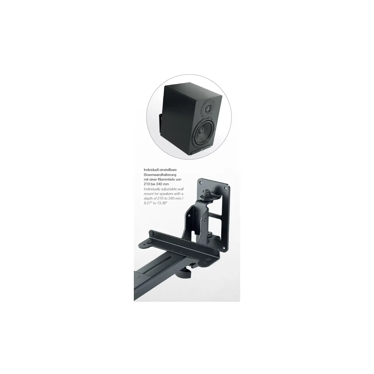 K&M 24167 Boxenwandhalterung »L«Solider und stabiler Wandhalter mit verstellbarem Ausleger für Monitore und Lautsprecher bis 15 kg. Der Ausleger ist beidseitig bis 54° schwenkbar und bis zu -17° stufenlos neigbar. Die Breite beträgt 200 mm und die Klemmtiefe reicht von 210 bis 340 mm. Selbstklebende Gummiauflagen schonen die Oberfläche der Box und verhindern Vibrationsgeräusche. Handliche Bedienelemente ermöglichen schnelle und komfortable Einstellungen, die dank zusätzlicher Kontermöglichkeiten auch fixiert bleiben. Die robuste Metallkonstruktion wird von einer strapazierfähigen Pulverbeschichtung geschützt.Produktdaten: