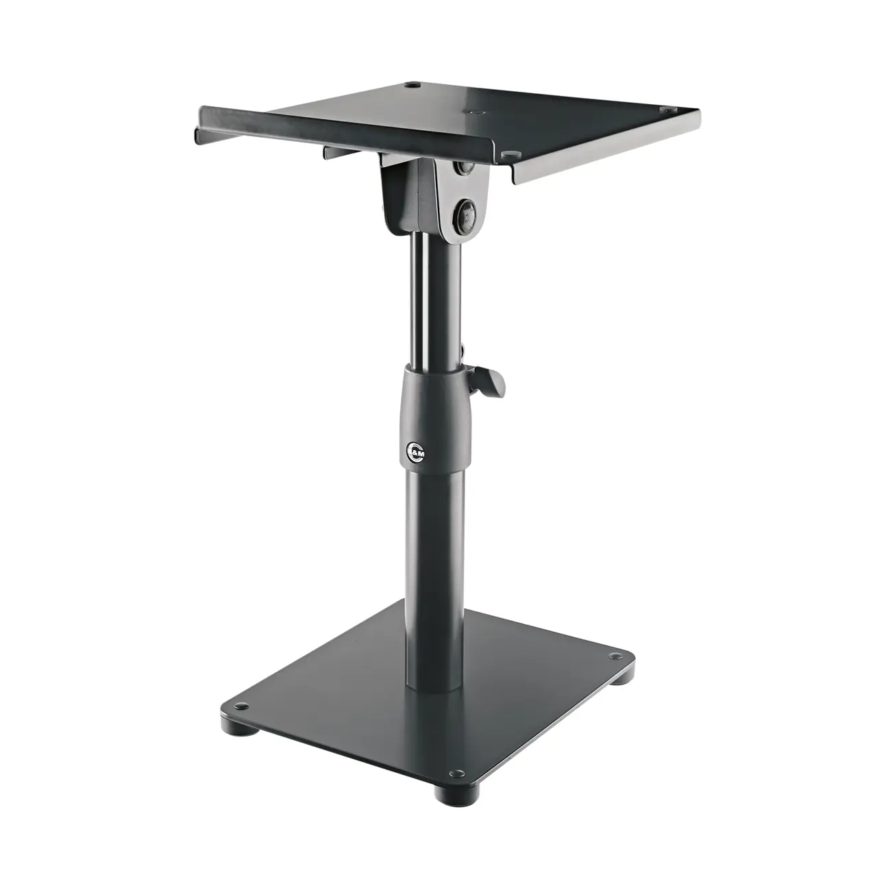 Höhenverstellbares Monitor-Tischstativ mit neigbarer Auflage. Die solide Metallkonstruktion mit der großen Auflageplatte (230 x 250 mm) ist für ein breites Spektrum an Monitoren und anderen Geräten in dieser Größenordnung geeignet. Die Platte ist bis 12,5° stufenlos neigbar und zur Optimierung des Schwerpunktes verschiebbar. Eine Anschlagleiste gewährleistet die nötige Sicherheit und verhindert ein Abrutschen des Monitors. Praktische 4-Punktauflagen mit Filzüberzug sorgen unter der Bodenplatte für Entkopplung. Die individuelle Höheneinstellung erfolgt in 4 Stufen zwischen 350 und 450 mm. Bezüglich der Tragfähigkeit kann das Stativ bis 25 kg zentrisch belastet werden. Im Lieferumfang enthalten sind Gummiauflagen zur sicheren, geräuschdämmenden Aufnahme der Monitore.