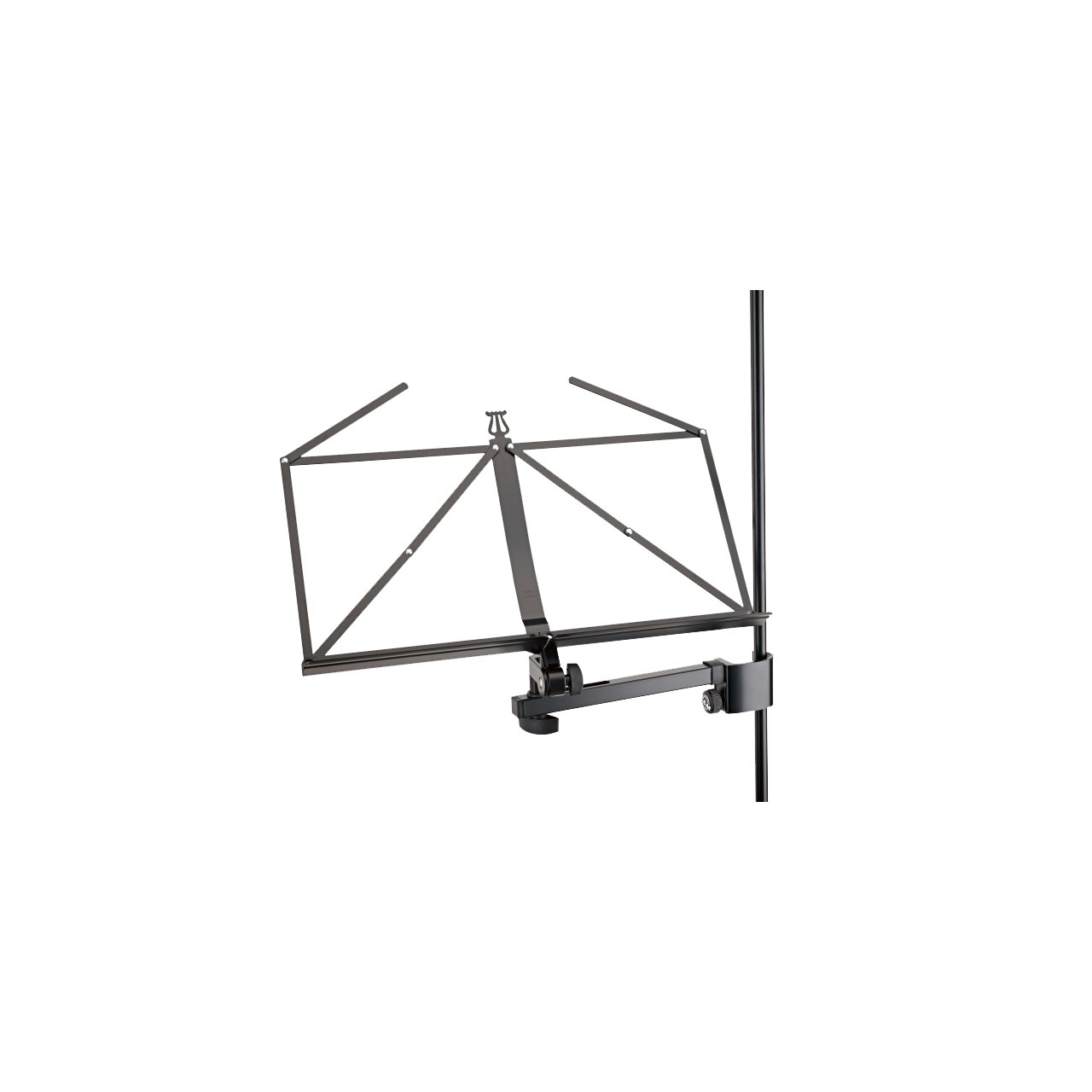 Großer faltbarer Notenpultkopf mit Auslegerarm aus Stahl zum Anschrauben an senkrechte Stativrohre. Der Klemmbereich für die Rohre liegt zwischen 11 und 30 mm. Der Notenpultkopf kann zudem im Abstand zum Stativrohr stufenlos zwischen 185 und 265 mm auf dem Auslegerarm positioniert werden. Die Klemmung und Ausrichtung des Notenpultkopfes erfolgen mittels einer handlichen Flügelschraube. Für den Transport kann der Notenpultkopf platzsparend zusammengelegt und eingeklappt werden.