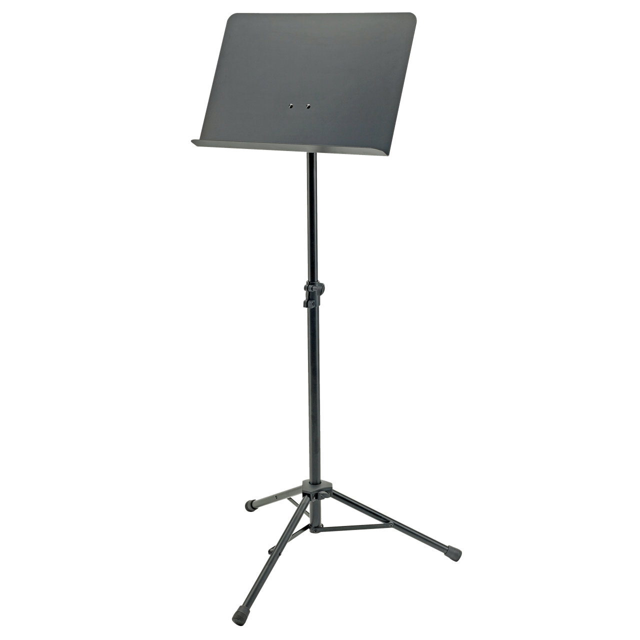 Robustes Orchesternotenpult komplett aus Stahl. Bewährte Verbindungselemente aus Kunststoff. Die Notenpultplatte kann mit einem praktischen und bedienerfreundlichen Schnellverschluss einfach und schnell montiert und abgenommen werden. Eine große handliche Flügelmutter erleichtert das Fixieren der Schrägstellung. Die stufenlose Höhenverstellung erfolgt über eine oberflächenschonende Spannhülse.