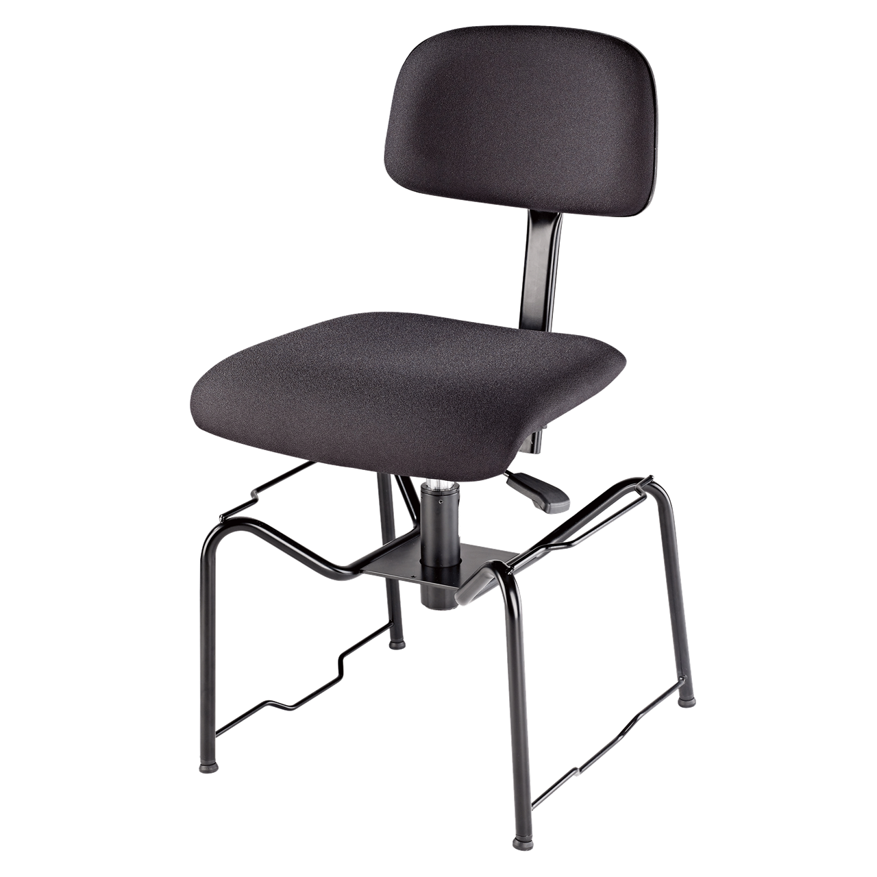 Komfortabler professioneller Orchesterstuhl mit gepolstertem Sitz und Rückenlehne. Polsterung und Stoff (Trevira CS) sind aus schwer entflammbarem Material. Der schwarze Stoff weist eine Strapazierfähigkeit von 100.000 Scheuertouren auf. Das schwarz gepulverte Fussgestell besteht aus robustem Stahlrohr mit 2 mm Wandstärke. Die Verstellung der Sitzhöhe erfolgt pneumatisch und stufenlos über einen Auslösehebel. Die Höhe der Lehne und die Sitzneigung sind ebenfalls einstellbar. Geräuscharme Kunststoffgleiter, Stapelstege und Stapelschutz sind weitere sinnvolle Eigenschaften. Die nach vorne abgerundete Sitzfläche mit Belüftungslöchern und der atmungsaktive Schaumstoff sorgen für ein entspanntes Sitzgefühl.