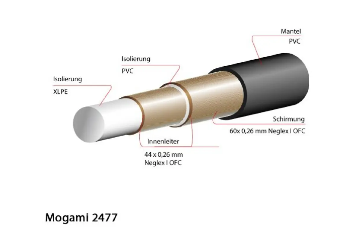 Professionelles HiFi-Lautsprecherkabel: Mogami 2477 Reference Neglex Dual-Coax, für ein hochauflösendes und detailreiches Klangbild.