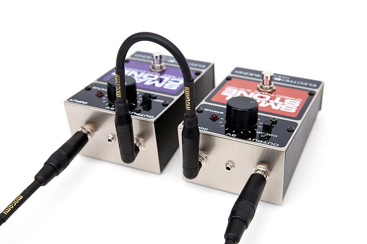 Professionelles Patch Pedal – Koaxial-Kabel: Mogami 2524 High Impedance Transmission, Schwarz, Koaxial, Stecker: Winkelstecker Amphenol ACPM-RB-AU, Amphenol ACPM-RB-AU, Schwarz verchromtes Gehäuse, vergoldete Kontakte. Die Patchkabel verwenden das MOGAMI 2524 Instrumentenkabel und zeichnen sich durch einen Innenleiter Aufbau aus 50 Einzeladern aus, wodurch höchste Flexibilität und Haltbarkeit garantiert werden. Das verwendete hochreine Kupfer (OFC) garantiert dabei höchste Signaltreue. Die extrem dichte Spiralschirmung sowie eine extra Abschirmung aus Carbon-PVC verhindern wirkungsvoll elektromagnetische Einstreuungen sowie mechanische Störgeräusche. Platz auf dem Effektboard findet sich mit den schmalen Amphenol Audio 6,3 mm Winkelklinke-Steckern dafür sicher.