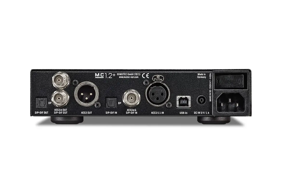 Der bidirektional arbeitende DDC von MUTEC verbindet umfangreiche Möglichkeiten der digitalen Audioformatwandlung mit klangoptimierenden Eigenschaften über den USB-Port. Als vielseitiger Formatwandler konvertiert der MC1.2+ typische PCM-Audiosignale über die Schnittstellen USB, AES/EBU, AES/EBUid, S/PDIF. Dieser Vorgang kann – auch über USB – gleichzeitig in beide Richtungen (In/Out) erfolgen. Diese Flexibilität ist z.B. im professionellen Tonstudio-Umfeld äußerst nützlich. Dort ermöglicht das kompakte MC1.2+ eine vielseitige und verlustfreie Signalübertragung in Echtzeit zwischen Audio-Interfaces, digitalen Mischpulten und Effektgeräten. Darüber hinaus verbessert dieser Digital-zu-Digital-Formatwandler von MUTEC mit Hilfe von rauscharmen Audio-Taktoszillatoren den USB-Audio-Stream durch Signalregeneration sowie Isolation der USB-Spannung. Dadurch können Störungen, die normalerweise über die Spannungsführung der USB-Schnittstelle in die Geräteschaltung induziert werden, die digitale Signalverarbeitung des MC1.2+ nicht mehr negativ beeinflussen. Dies führt zu einer deutlichen Reduzierung des digitalen Rauschens und des Taktzitterns (=Jitter).