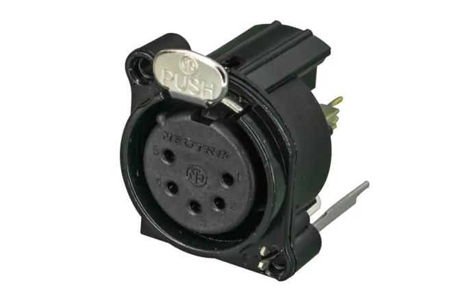 5 polige Chassisbuchse mit schwarzverchromtem Metallflansch, Erdung: Separater Massekontakt mit dem Gehäuse des Gegensteckers und Front Panel, vertikale Leiterplattenmontage