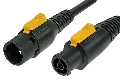 Ein verriegelbares Stromkabel mit powerCON TRUE1 female NAC3FX-W auf male NAC3MX-W. Das Gummikabel hat einen Leiterquerschnitt von 3×1.5 mm2 und ist freigegeben nach VDE und ENEC.