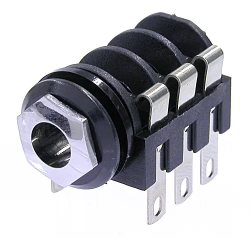 6.35 mm Stereo Klinkenbuchse, schaltbar, mit Chromhülse und Standard Lötanschlüssen, Montagemutter inklusive