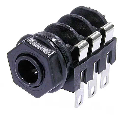 6.35 mm Stereo Klinkenbuchse, schaltbar, mit Vollgewindeschraubanschluss und Standard Lötanschlüssen, Montagemutter inklusive