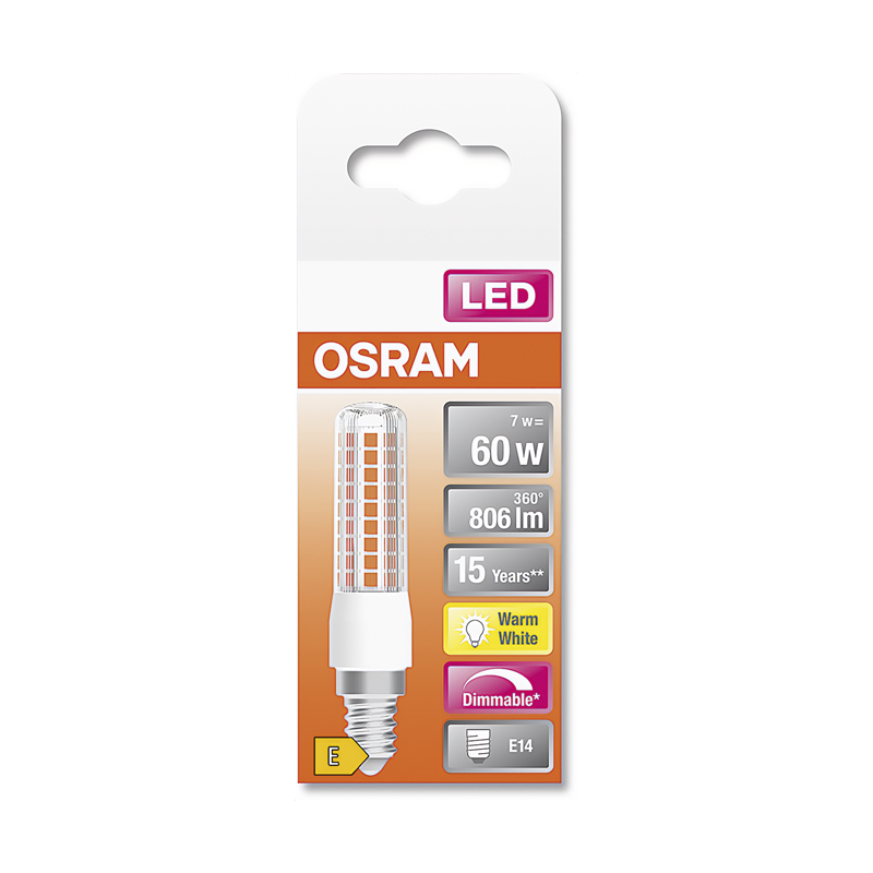 Osram LED T Slim Dim 60, LED Lampe, E14 240V 7W (60W) 806lm, 2700K warm white, dimmbar, Ø 20mm, Länge 92mm