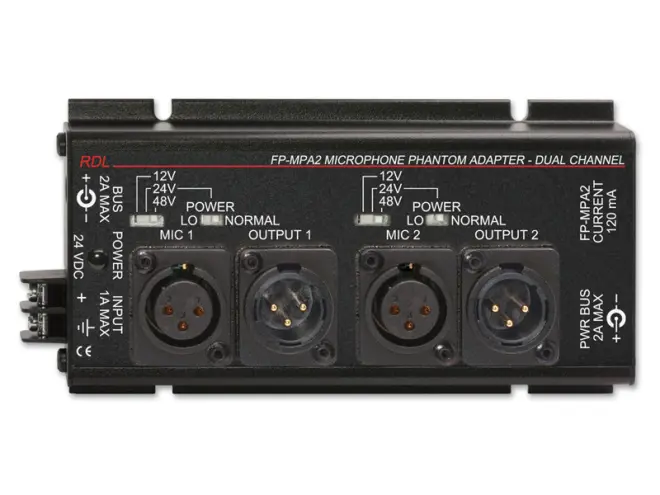 Das Audiosignal wird potentialfrei an die XLR Ausgangsbuchsen geleitet. Die Phantomspannung lässt sich individuell für beide Kanäle einstellen. Für Mikrofone die mit 24 V betrieben werden, aber höhere Entkopplungswiderstände benötigen lassen sich im 24 V Betrieb zwei vershiedene durch die Schalterstellung LO / NORMAL, Werte der Entkopplungswiderstände wählen. Die Phantomspannung wird erzeugt durch einen DC-DC Konverter. Die Ausgänge sind gegen Kurzschlüsse geschützt. Die Schalter des RDL-FP-MPA2 sind versenkt in der Front eingebaut so das versehentliche Betätigung der Schalter ausgeschlossen ist.