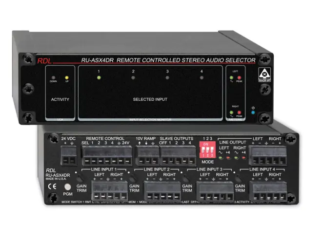 Das RDL-RU-ASX4DR ist ein Stereo Audioselektor mit vier Eingängen, Eingangstrimmern, und Pegelanzeige für den Ausgangspegel. Das Modul hat eine interne VCA Pegelregelung für den Ausgangspegel. Eingangswahl und Regelung des Ausgangspegels geschieht durch eine angeschlossene RDL Fernsteuerung. Es können bei Bedarf mehrere Fernsteuerungen angeschlossen werden zur Regelung von verschiedenen Stellen. Anschlüsse an der Rückplatte erlauben Steuerung durch verschiedene RDL-Fernsteuerungen oder Geräte anderer Hersteller.