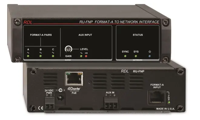 Der Format-A Eingang des RDL-RU-FN erlaubt Anschluss von allen Format-A Sendern von verschiedenen Orten an Wandmontageplatten sowie von weiteren Modulen in Racks oder Geräteschränken. Die große Auswahl an Format-A Sendern bietet Kompatibilität mit weiteren Audiogeräten die mit Standard professionellen Audiopegeln arbeiten. Digitalaudio mit hoher Auflösung in Verbindung mit hochwertiger RDL Filterung bieten sehr hohe Übertragungsqualität mit sehr geringem Rauschen. Jeder Format-A Sender kann in unmittelbarer Nähe des RDL-RU-FN, oder in Entfernungen von über 1000 Meter installiert werden.
