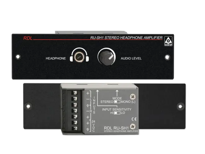 Das RDL-RU-SH1 ist ein zweikanaliger Kopfhörerverstärker mit symmetrischen oder asymmetrischen Eingängen. Eingangspegel von -20 dBV bis +20 dBu können angeschlossen werden. Zwei Schalter die seitlich am Modul angebracht sind werden vor Montage eingestellt. Ein Schalter stellt die Eingangsempfindlichkeit ein. Der andere Schalter wählt zwischen Mono- oder Stereobetrieb. Im Monobetrieb wird der linke Eingang für beide Ausgangskanäle benutzt. Nur der linke Eingang sollte in diesem Fall benutzt werden.