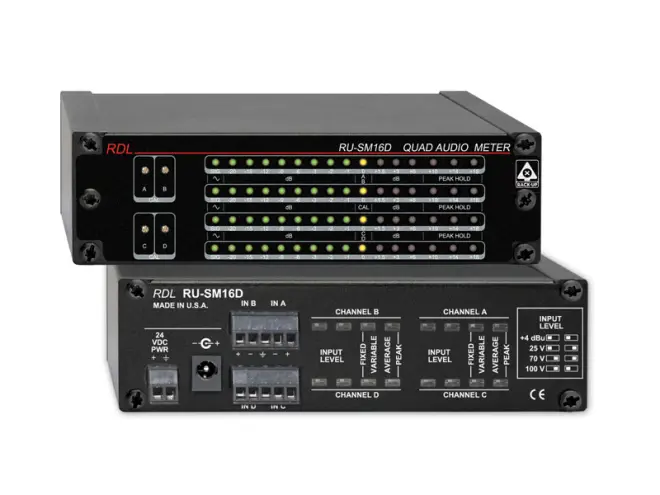 Das RDL-RU-SM16D ist die ideale Wahl für Systeme in welchen eine Audiopegelanzeige benötigt wird, oder nachgerüstet werden soll. Das RDL-RU-SM16D hat vier separate Eingänge. Jeder Eingang kann asymmetrische Consumersignale, symmetrische Signale, Signale von Leistungsverstärkern sowie von Konstantspannungsverstärkern (25 V, 70 V oder 100 V) annehmen. Alle Anschlüsse sind an Schraubanschlussblöcken.