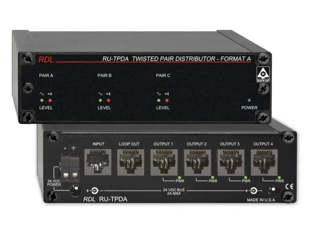 Die RJ45 Eingangsbuchse kann Signale von einem oder mehreren Format-A Sendermodulen annehmen. Die LOOP OUT Buchse erlaubt Anschluss eines weiteren Verteilers. Es können bis zu zehn RDL-RU-TPDA Module an einander angeschlossen werden um 40 Ausgänge zur Verfügung zu stellen. Erweiterung ist möglich wenn ein Verteilerausgang benutzt wird bis zu zehn weitere Verteilereingänge an zu steuern.