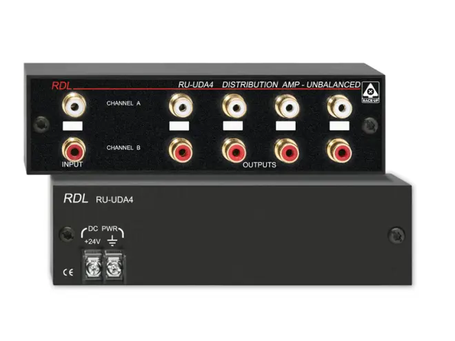 Das RDL-RU-UDA4 Modul bietet asymmetrische Linepegel-Verteilung. Das Modul ist mit zwei separaten Kanälen versehen und kann als Stereoverstärker oder als zwei unabhängige Mono-Verteilerverstärker benutzt werden. Die beiden Eingänge des RDL-RU-UDA4 speisen jeweils 4 separate, asymmetrische Linepegel Treiber-Verstärker.