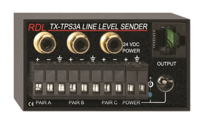 Das RDL-TX-TPS3A is t ein Sendermodul für drei Kabelpaare Einsatz mit RDL Format-A Twisted Pair Produkten. Drei Linepegel-Quellen können an die asym. -10 dBV Cinchbuchsen- Eingänge oder an die sym. +4 dBu Eingänge mit Anschlussblock angeschlossen werden. Treiberverstärker in Studioqualität speisen die RJ45-Buchse mit optimalen Arbeitspegeln.