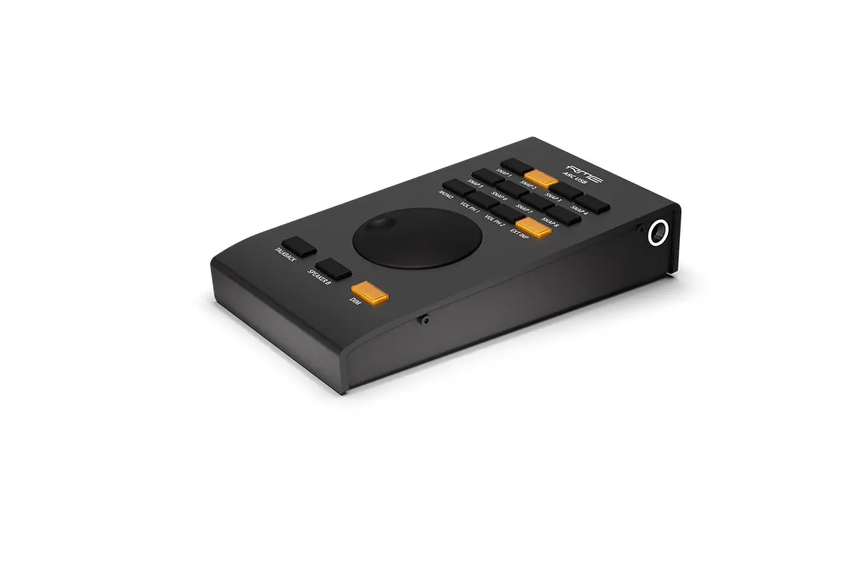 Die ARC USB (Black Edition) wird per USB mit dem Computer verbunden und kommuniziert direkt mit TotalMix FX. Sie ist mit 15 frei zuweisbaren, beleuchteten Tastern, einem Encoder-Rad und einem Klinkenstecker zum Anschliessen eines Fussschalters ausgestattet. Die ARC USB ist eine USB 1.1 MIDI-Fernbedienung für das Fireface UFX+ und alle anderen RME Geräte. Da sie als Gerät der UAC 1 Klasse arbeitet ist sie nativ kompatibel mit Windows und Mac OS X. Sobald sie im Betriebssystem angemeldet ist, wird die ARC USB (Black Edition) automatisch von TotalMix FX erkannt, die Kommunikation zur Steuerung des UFX+ findet per einfacher MIDI-Befehle statt.