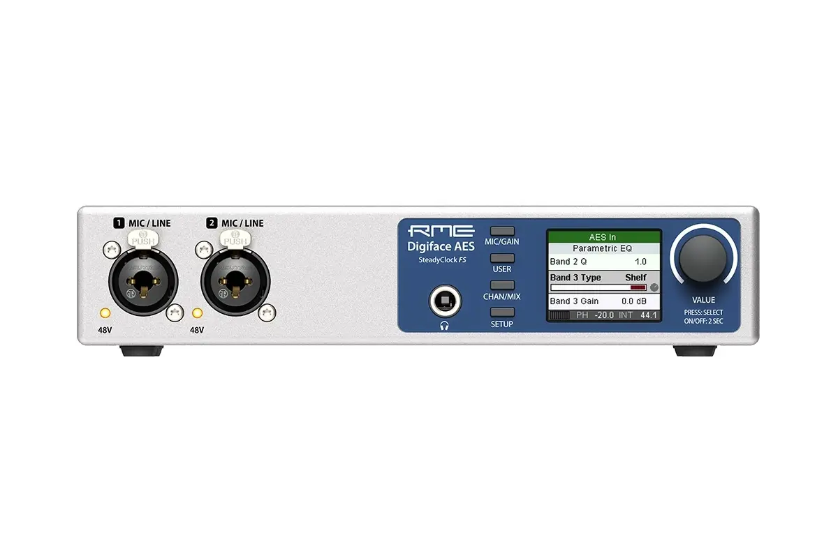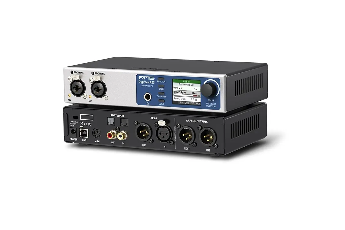 Mit SteadyClock FS, vollem Standalone-Betrieb und eingebautem parametrischem EQ glänzt das Digiface AES als perfekte All-in-One-Lösung für die Aufnahme und Wiedergabe von digitalen und analogen Quellen sowie für flexibles Playback/Monitoring über TotalMix FX.