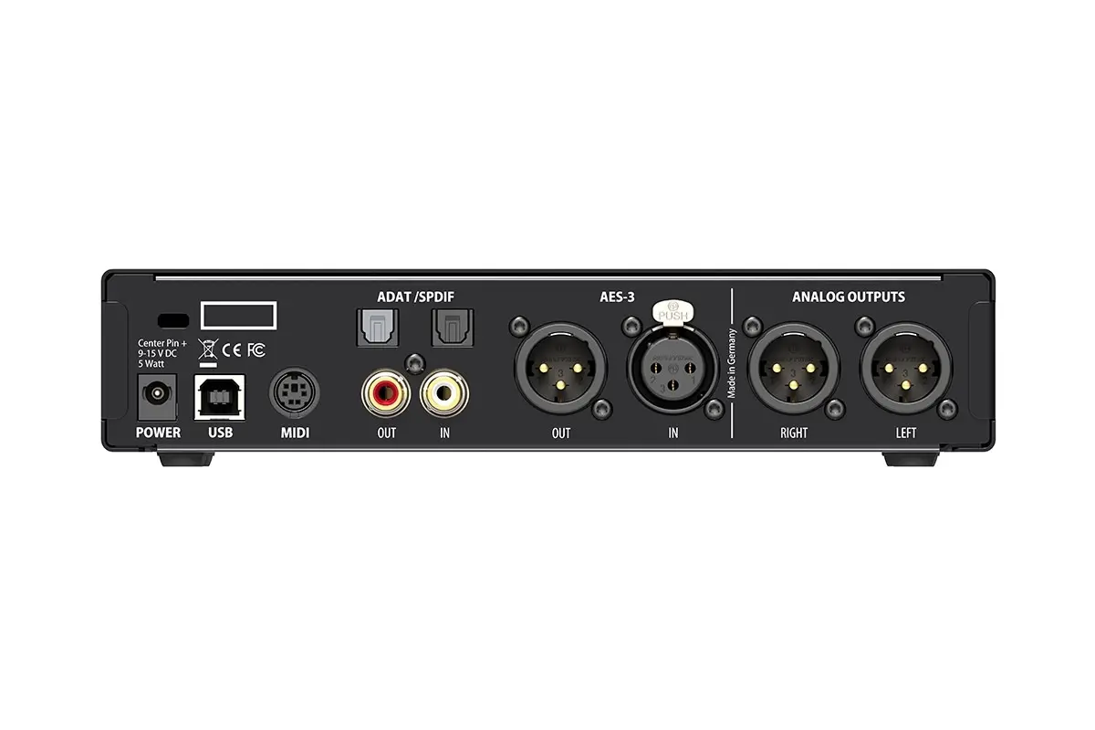 Die umfangreichen digitalen Ein- und Ausgänge, die sich um einen AES/EBU-Eingang und einen XLR-Ausgang gruppieren, umfassen auch SPDIF Coax, SPDIF Optical oder 8-Kanal ADAT. Alle Ein- und Ausgänge können gleichzeitig genutzt werden, was das Gerät zu einem Schweizer Taschenmesser-Interface macht, das alle gängigen digitalen Audioformate empfängt und sendet. Ein integrierter SRC (Sample Rate Converter) kann auf einen der drei Eingänge geschaltet werden, um Taktprobleme zu lösen und sich an andere Abtastraten anzupassen.
