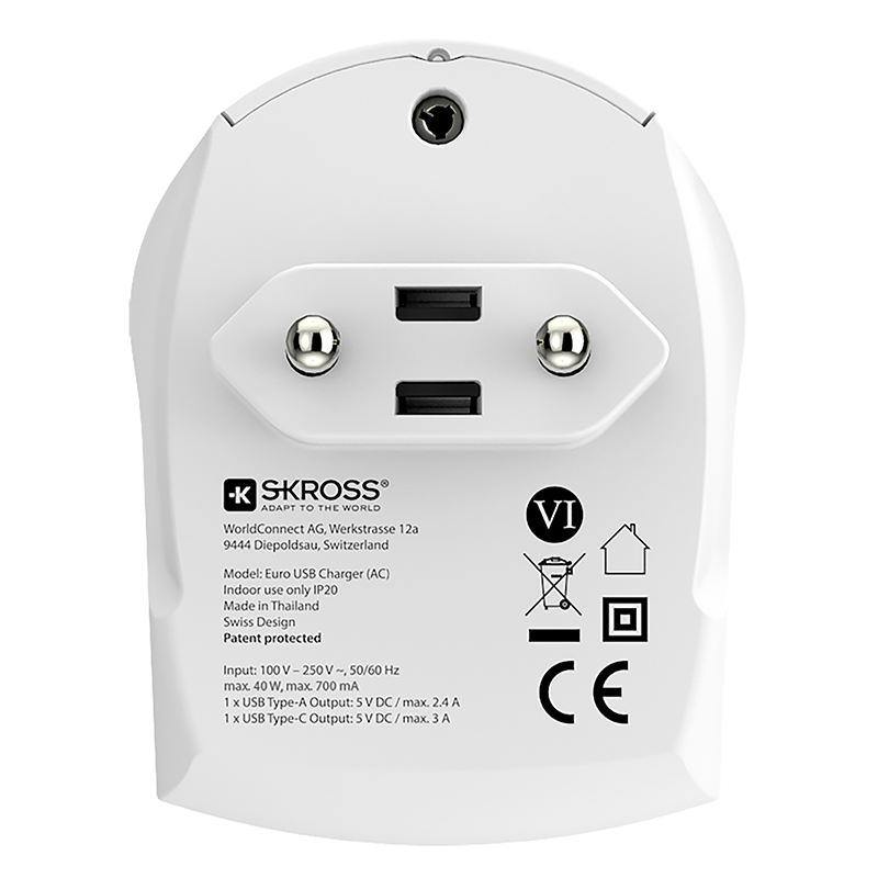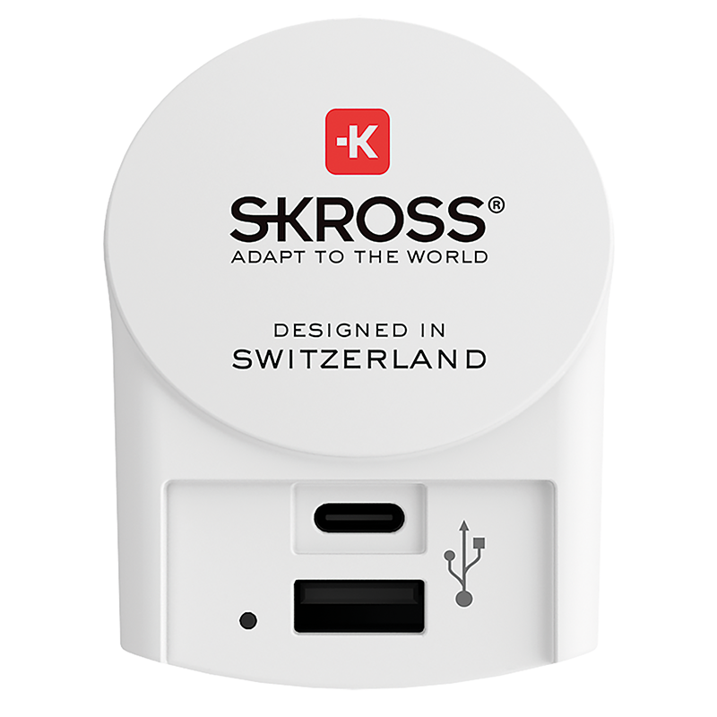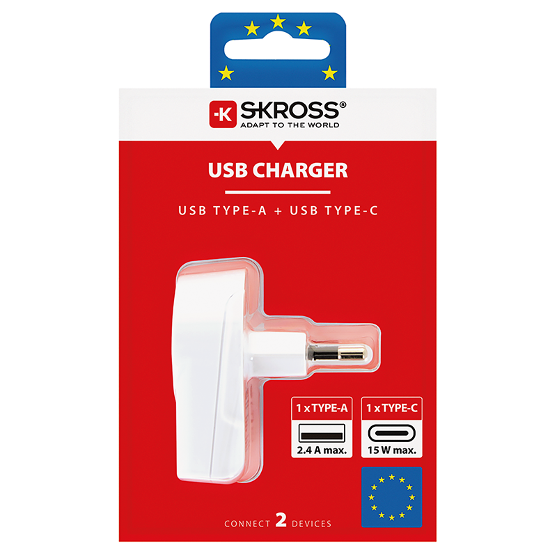SKROSS Ladeadapter 1xUSB-A + 1xUSB-C, Eingangsspannung: 110V-250V, Leistung: max. 27W, Last: USB-A max. 2.4A / USB-C max. 3A, weiss