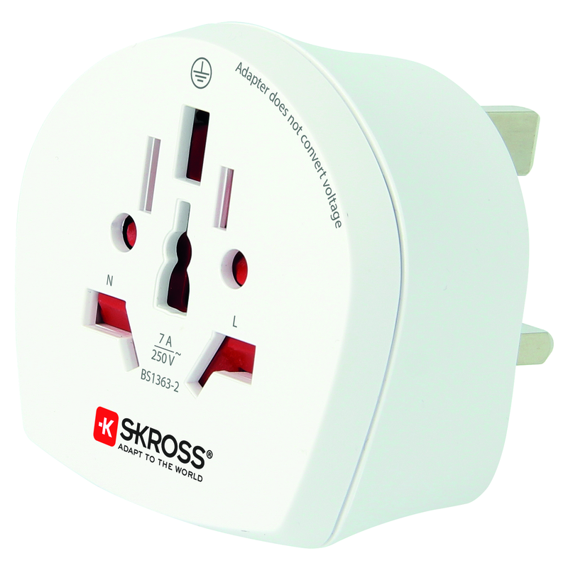 SKROSS Reiseadapter World – UK, 3-polig, Steckdoseneingang für: Schweiz, Italien, Brasilien, USA/Japan, Australien/China, Euro, Ausgangsstecker: UK, Eingangsspannung: 100V-250V, Leistung: 100V – 700W / 250V – 1750W, Last: max. 7A, inkl. Sicherung (austauschbar), weiss