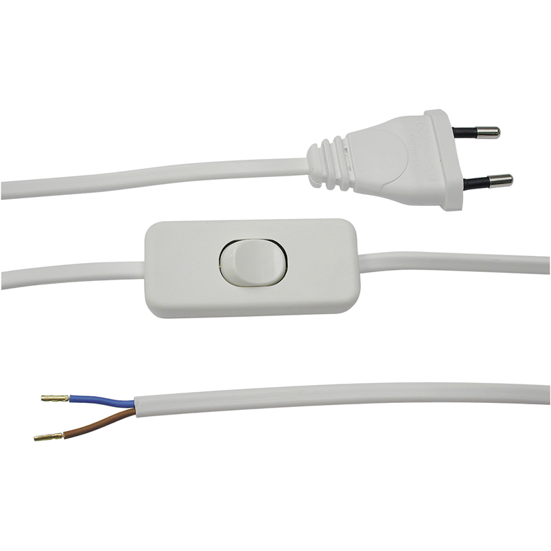 Anschlusskabel Tdlf H03VVH2-F 2×0.75mm2, Kabellänge 1.8m, 1. Seite Stecker T26, 2. Seite 30mm abgemantelt und 6mm abisoliert mit Aderendhülsen, inkl. integriertem Schnurschalter, weiss