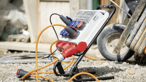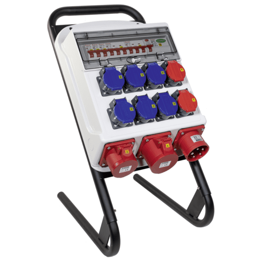 Baustromverteiler IP44 32A, Steckdosen IP55 6x16A/3P/T23 + 2x16A/5P/T25, Steckdosen IP44 1x16A/5 CEE + 1x32A/5 CEE, Leistungsschutzschalter 1xRCCB 40A/30mA/4P/Typ A, 3xMCB 16A/1P, 2xMCB 16A/3P, montiert auf Ständer 405x545mm, zur Verwendung mit Standfuss oder als Wandmontage