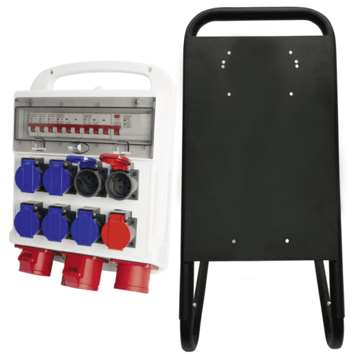Baustromverteiler IP44 32A, Steckdosen IP55 6x16A/3P/T23 + 2x16A/5P/T25, Steckdosen IP44 1x16A/5 CEE + 1x32A/5 CEE, Leistungsschutzschalter 1xRCCB 40A/30mA/4P/Typ A, 3xMCB 16A/1P, 2xMCB 16A/3P, montiert auf Ständer 405x545mm, zur Verwendung mit Standfuss oder als Wandmontage