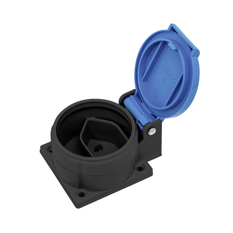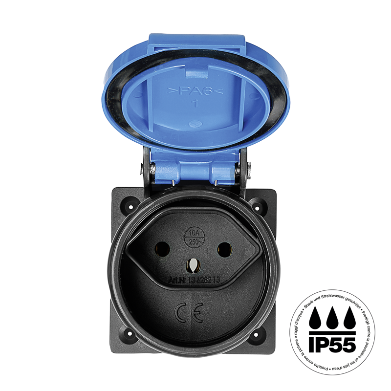 Einbausteckdose 1x TYP 13 (10A/250V), inkl. Dichtung und vormontierten Schrauben, mit Schraubklemmen, IP55, anthrazit/Deckel hellblau