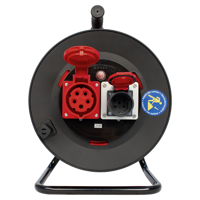 Kunststoff Kabelrolle 1xCEE16/5 + 1xT25 mit Klappdeckel, Kabel Bauflex N07V3V3-F 5G1.5mm2 rot, Kabellänge 33m, Stecker CEE16/5, Thermoschutzschalter, robust und baustellentauglich (K2), IP44/IP55, schwarz